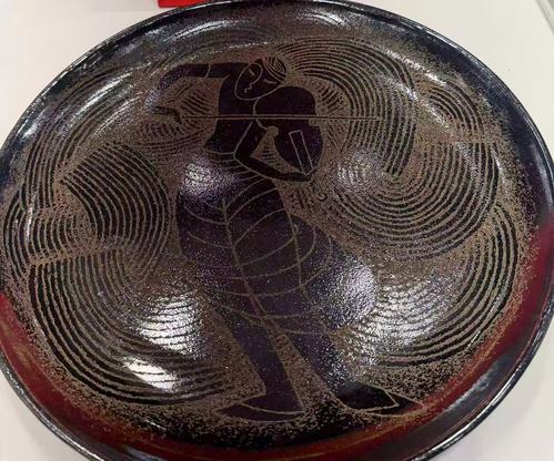 此次入馆收藏的两件作品,是传统文脉与当代审美的精彩对话。郑勇教授创作的《茶叶末釉犀皮漆罐》,采用陶胎为骨,施以经典的茶叶末釉进行高温烧制,釉色黄绿交织,古雅天成,尽显沉稳厚重之气。尤为精妙的是,作品表面融入了传统犀皮漆工艺,纹理行云流水,触感温润如玉,釉之凝重与漆之华美相得益彰、层次丰富,承载着陶瓷文脉与大漆技艺的双重基因。华磊老师创作的刻瓷作品《旋律》,以刀代笔,以乌金釉瓷盘为纸,采用津派华氏刻瓷特有的刻画技法,通过深浅有致、疏密相间的刀痕,将黑釉剔刻出浅金色的胎底,形成了强烈的明暗对比与视觉张力。画面主体人物线条凝练、造型概括,刀工爽利精准,尽显刻瓷工艺的肌理之美与人文情怀。