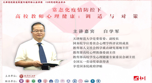 2022年3月18日下午,我校党委教师工作部联合天津师范大学等14所院校党委教师工作部共同举办专题网络公益讲座。本次讲座特邀全国知名心理学家、天津师范大学副校长白学军教授针对常态化疫情防控下高校教师心理健康调适的对策和方法进行专题讲授。