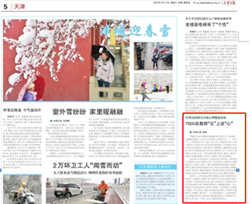 据悉,3月19日的《天津日报》在第5版以《15所高校联合开展心理健康讲座 7600名教师“云”上谈“心”》为题对这次活动进行了报道。此次讲座是我校深入贯彻习近平总书记关于疫情防控工作重要讲话精神,认真落实国务院、天津市委和天津市教育两委等各级部门防疫工作部署要求的重要举措之一,为缓解我校教职工在疫情防控常态化下面临的工作压力,协助教师做好心理健康调试起到了良好效果。(审稿:党委教师工作部 邵伟 蔺洪全 编辑:党委宣传部 李焕峰)