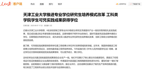 人民日报客户端丨天津工业大学推进专业学位研究生培养模式改革 工科类学院学生可凭实践成果获得学位