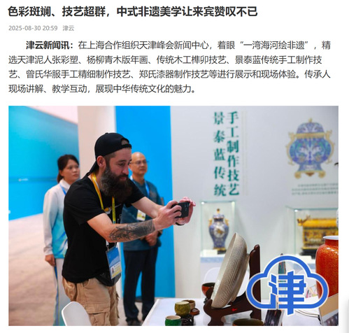 津云新闻讯:在上海合作组织天津峰会新闻中心,着眼“一湾海河绘非遗”,精选天津泥人张彩塑、杨柳青木版年画、传统木工榫卯技艺、景泰蓝传统手工制作技艺、曾氏华服手工精细制作技艺、郑氏漆器制作技艺等进行展示和现场体验。传承人现场讲解、教学互动,展现中华传统文化的魅力。