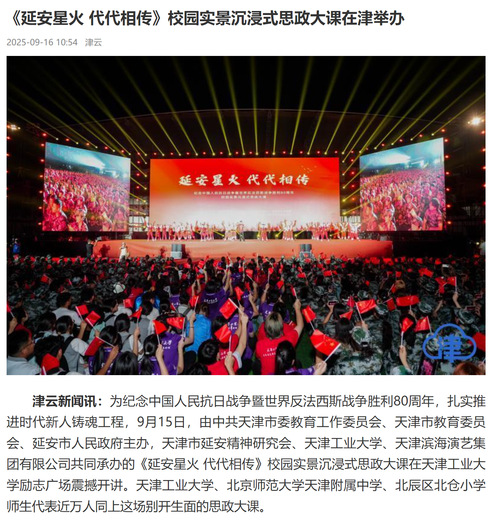 津云新闻讯:为纪念中国人民抗日战争暨世界反法西斯战争胜利80周年,扎实推进时代新人铸魂工程,9月15日,由中共天津市委教育工作委员会、天津市教育委员会、延安市人民政府主办,天津市延安精神研究会、天津工业大学、天津滨海演艺集团有限公司共同承办的《延安星火 代代相传》校园实景沉浸式思政大课在天津工业大学励志广场震撼开讲。天津工业大学、北京师范大学天津附属中学、北辰区北仓小学师生代表近万人同上这场别开生面的思政大课。