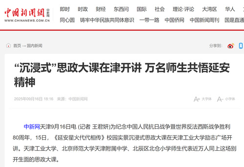 中新网天津9月16日电 (记者 王君妍)为纪念中国人民抗日战争暨世界反法西斯战争胜利80周年,15日,《延安星火代代相传》校园实景沉浸式思政大课在天津工业大学励志广场开讲。天津工业大学、北京师范大学天津附属中学、北辰区北仓小学师生代表近万人同上这场别开生面的思政大课。