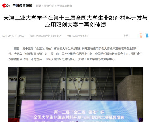 中国教育在线丨天津工业大学学子在第十三届全国大学生非织造材料开发与应用双创大赛中再创佳绩