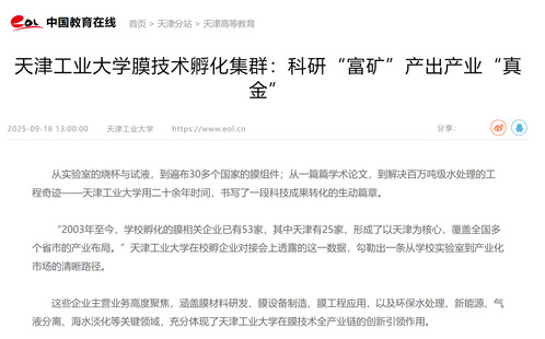 中国教育在线丨天津工业大学膜技术孵化集群:科研“富矿”产出产业“真金”