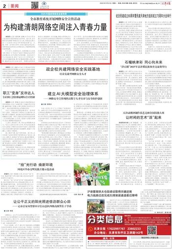天津日报丨2025年国家网络安全宣传周全市教育系统开展网络安全宣传活动为构建清朗网络空间注入青春力量
