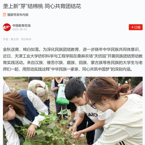 金秋送爽,棉白如雪。为深化民族团结教育,进一步铸牢中华民族共同体意识,近日,天津工业大学纺织科学与工程学院在桑麻农场“天纺园”开展民族团结劳动教育实践活动。来自汉族、维吾尔族、藏族、回族、蒙古族等各民族的大学生与老师们一起,用劳动实践诠释“中华民族一家亲,同心共筑中国梦”的深刻内涵。