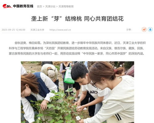 金秋送爽,棉白如雪。为深化民族团结教育,进一步铸牢中华民族共同体意识,近日,天津工业大学纺织科学与工程学院在桑麻农场“天纺园”开展民族团结劳动教育实践活动。来自汉族、维吾尔族、藏族、回族、蒙古族等各民族的大学生与老师们一起,用劳动实践诠释“中华民族一家亲,同心共筑中国梦”的深刻内涵。