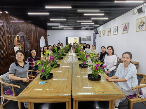 本次活动选址在充满书香与雅韵的博雅书院雅园。在专业老师指导下,教职工从挑选花材开始,仔细端详每一朵花、每一片叶,用心感受它们的形态、色彩与质感。随后,便是巧妙的构思与布局,老师们将原本随意摆放的花材,按照中式插花独特的程式与韵律进行组合。随后展开了热烈的现场交流,大家共同探讨借草木表达情绪,彼此分享对静美的体验与心悦感受。