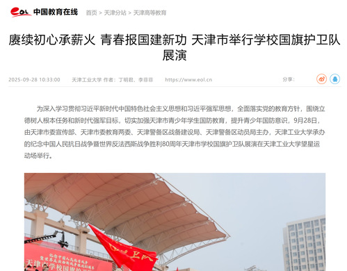 为深入学习贯彻习近平新时代中国特色社会主义思想和习近平强军思想,全面落实党的教育方针,围绕立德树人根本任务和新时代强军目标,切实加强天津市青少年学生国防教育,提升青少年国防意识,9月28日,由天津市委宣传部、天津市委教育两委、天津警备区战备建设局、天津警备区动员局主办,天津工业大学承办的纪念中国人民抗日战争暨世界反法西斯战争胜利80周年天津市学校国旗护卫队展演在天津工业大学望星运动场举行。