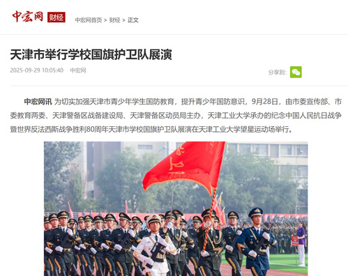 中宏网讯 为切实加强天津市青少年学生国防教育,提升青少年国防意识,9月28日,由市委宣传部、市委教育两委、天津警备区战备建设局、天津警备区动员局主办,天津工业大学承办的纪念中国人民抗日战争暨世界反法西斯战争胜利80周年天津市学校国旗护卫队展演在天津工业大学望星运动场举行。