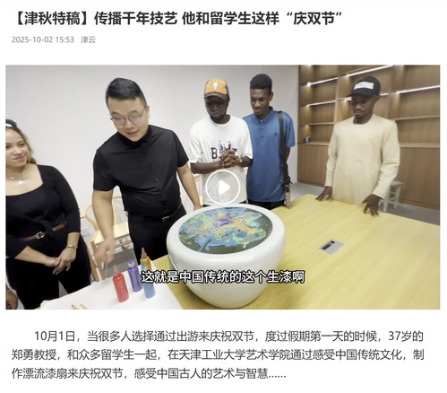 “双节快乐!”10月1日下午,天津工业大学艺术学院里,郑勇和多国留学生一起手举自己制作的漂流漆扇,面带笑容地喊道。
