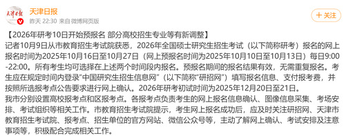 “天津日报”微博丨2026年研考10日开始预报名 部分高校招生专业等有新调整