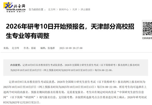 北方网丨2026年研考10日开始预报名,天津部分高校招生专业等有调整