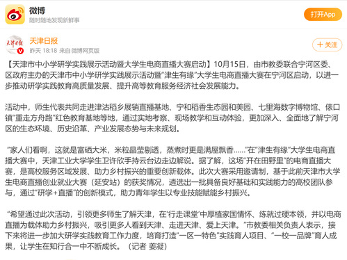 “天津日报”微博丨天津市中小学研学实践展示活动暨大学生电商直播大赛启动