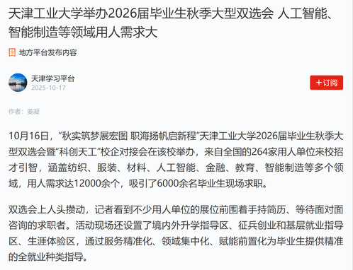 学习强国丨天津工业大学举办2026届毕业生秋季大型双选会 人工智能、智能制造等领域用人需求大