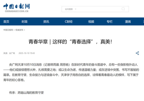 央广网天津10月10日消息(记者韩雨晨 周思杨)在新时代青年的奋斗图谱中,总有一些身影格外动人——他们或接续理想火种,扎根需要之地;或以生命为诺,传递温暖力量;或在逆境中突围,书写不服输的篇章。在教育守望、生命接力与逆境奋斗中,天津学子用各自的选择,诠释着青春最动人的模样,写下属于青年的初心答卷。