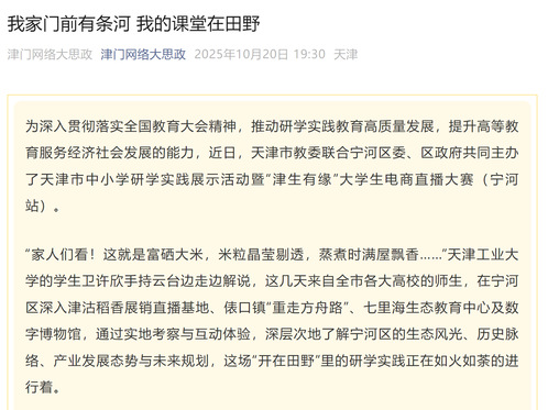 为深入贯彻落实全国教育大会精神,推动研学实践教育高质量发展,提升高等教育服务经济社会发展的能力,近日,天津市教委联合宁河区委、区政府共同主办了天津市中小学研学实践展示活动暨“津生有缘”大学生电商直播大赛(宁河站)。