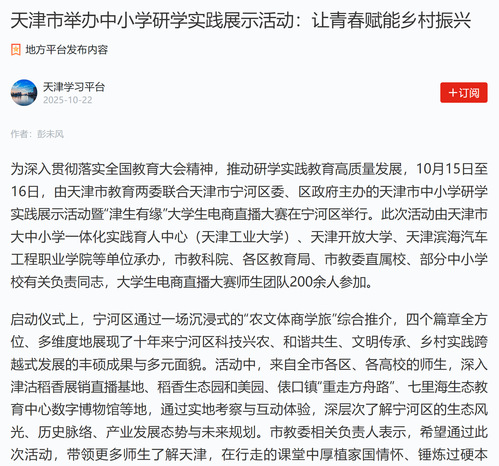 为深入贯彻落实全国教育大会精神,推动研学实践教育高质量发展,10月15日至16日,由天津市教育两委联合天津市宁河区委、区政府主办的天津市中小学研学实践展示活动暨“津生有缘”大学生电商直播大赛在宁河区举行。此次活动由天津市大中小学一体化实践育人中心(天津工业大学)、天津开放大学、天津滨海汽车工程职业学院等单位承办,市教科院、各区教育局、市教委直属校、部分中小学校有关负责同志,大学生电商直播大赛师生团队200余人参加。