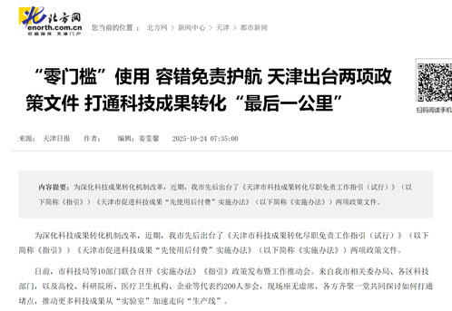 北方网丨“零门槛”使用 容错免责护航 天津出台两项政策文件 打通科技成果转化“最后一公里”