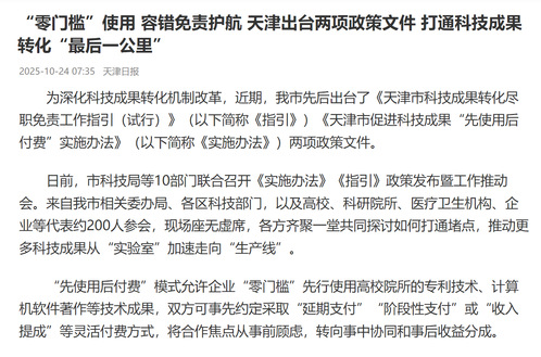 津云丨“零门槛”使用 容错免责护航 天津出台两项政策文件 打通科技成果转化“最后一公里”