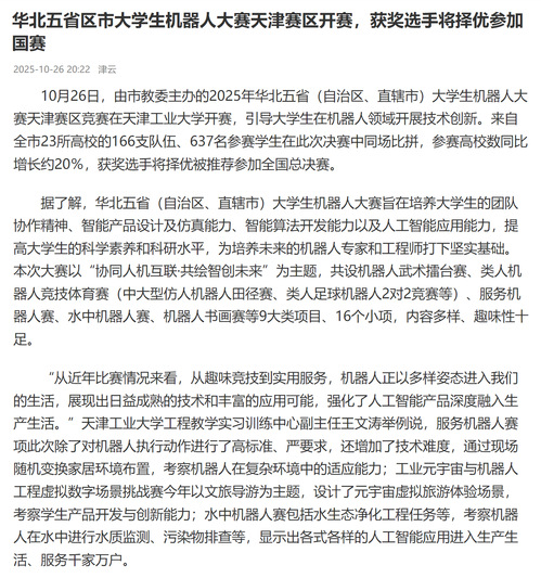 10月26日,由市教委主办的2025年华北五省(自治区、直辖市)大学生机器人大赛天津赛区竞赛在天津工业大学开赛,引导大学生在机器人领域开展技术创新。来自全市23所高校的166支队伍、637名参赛学生在此次决赛中同场比拼,参赛高校数同比增长约20%,获奖选手将择优被推荐参加全国总决赛。