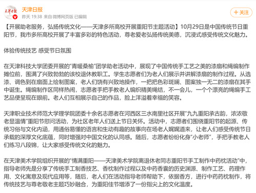 “天津日报”微博丨开展助老服务,弘扬传统文化——天津多所高校开展重阳节主题活动