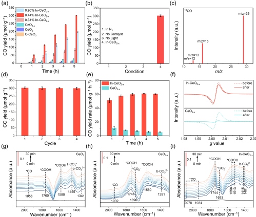 图3. (a) C-CeO2、CeO2、CeO2-x和In-CeO2-x的光催化活性比较。(b)不同条件下In-CeO2-x的光催化性能。(c) In-CeO2-x的13C同位素标记试验。(d) In-CeO2-x的稳定性试验。(e)光催化CO2在CeO2-x和In-CeO2-x上转化过程中CO生成速率的演化。(f)光催化CO2还原前后CeO2-x和In-CeO2-x的EPR光谱。(g–i)随辐照时间增加,CO2光还原在(g) CeO2,(h) CeO2-x和(i) In-CeO2-x上的原位漫反射红外光谱。