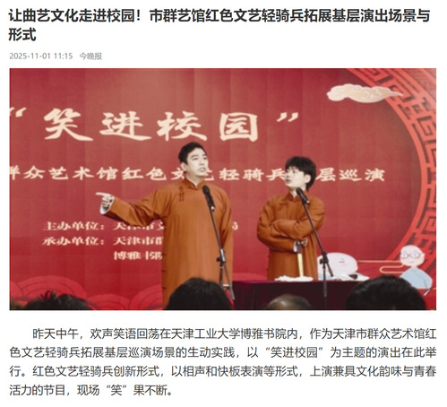 据了解,这是市群艺馆红色文艺轻骑兵今年首次进入高校。演出在快板《天安门广场看升国旗》中开启,一场精彩纷呈的“相声大会”让师生沉浸其中:《一鸣惊人》演绎成长路上的趣味故事,《一定之规》以诙谐视角解读“守规明礼”的智慧,《竹韵声声》在诙谐对话中展现传统曲艺魅力,为演出画上圆满句号。整场演出包袱不断,气氛火爆,演员们的精彩表现牢牢吸引着观众的视线。演出结束后,师生们纷纷表示,这次“笑进校园”的演出,如同感受了一场最具天津特色的茶馆相声,让大家深刻感受到中华优秀传统文化的魅力与红色精神的强大感召力。继本周在津南区颐养院举行演出后,市群艺馆红色文艺轻骑兵团队再次将优质文化资源送至师生身边,为校园文化建设注入了新鲜活力,丰富了师生的精神文化生活。(记者 王轶斐 图片由主办方提供)