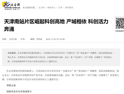 在京津冀协同发展的版图上,天津南站片区正在经历从“交通节点”到“黄金接口”的蝶变。依托高铁枢纽这一核心支点,天津南站片区精准布局产业生态,全面重构城市功能,走出一条“以站带产、以产兴城、以城聚人”的发展之路,让科技创新的种子在这片宜居宜业的沃土上蓬勃生长。