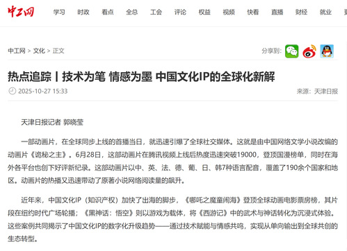 近年来,中国文化IP(知识产权)加快了出海的脚步,《哪吒之魔童闹海》登顶全球动画电影票房榜,其片段在纽约时代广场轮播;《黑神话:悟空》则以游戏为载体,将《西游记》中的武术与神话转化为沉浸式体验。这些案例共同揭示了中国文化IP的数字化升级趋势——通过技术赋能与情感共鸣,实现从单向输出到全球共创的生态转型。