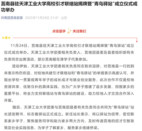 11月24日,莒南县驻天津工业大学高校引才联络站揭牌暨“青鸟驿站”成立仪式成功举办。天津工业大学团委相关负责人、莒南团县委及县委组织部有关负责同志出席活动,部分莒南籍在津学子代表参加。