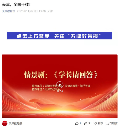由天津市政研会推荐,天津市委网信办、天津市教委指导,知乎天津推出的网络思政案例《以青年对话青年,打造“学长请回答”网络思政新载体》荣获2025年基层思想政治工作“十佳”案例并参加现场展示。展示案例以新时代青年破解成长难题,树立正确的价值观和人生态度为蓝本,精心编排了音乐情景剧《学长请回答》,在网络思政领域奏响激昂的津门主旋律。
