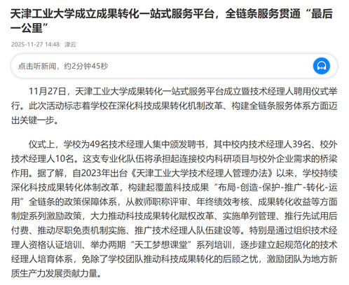 11月27日,天津工业大学成果转化一站式服务平台成立暨技术经理人聘用仪式举行。此次活动标志着学校在深化科技成果转化机制改革、构建全链条服务体系方面迈出关键一步。