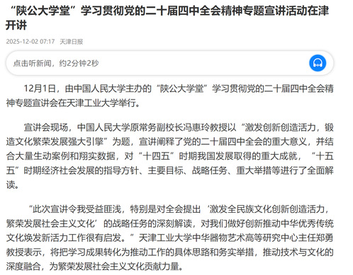 12月1日,由中国人民大学主办的“陕公大学堂”学习贯彻党的二十届四中全会精神专题宣讲会在天津工业大学举行。