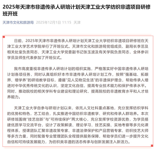 “天津市文化和旅游局”微信公众号丨2025年天津市非遗传承人研培计划天津工业大学纺织非遗项目研修班开班