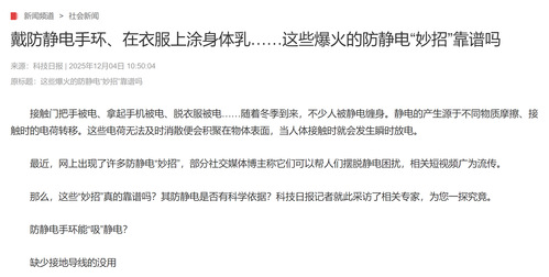 央视网丨戴防静电手环、在衣服上涂身体乳……这些爆火的防静电“妙招”靠谱吗