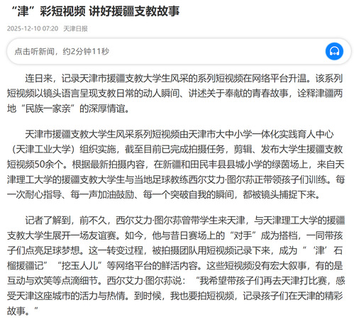 记者了解到,前不久,西尔艾力·图尔荪曾带学生来天津,与天津理工大学的援疆支教大学生展开一场友谊赛。如今,他与昔日赛场上的“对手”成为搭档,一同带孩子们点亮足球梦想。这一转变过程,被拍摄团队用短视频记录下来,成为“‘津’石榴援疆记”“挖玉人儿”等网络平台的鲜活内容。这些短视频没有宏大叙事,有的是互动与欢笑等点滴细节。西尔艾力·图尔荪说:“我希望带孩子们再去天津打比赛,感受天津这座城市的活力与热情。到时候,我也要拍短视频,记录孩子们在天津的精彩故事。”