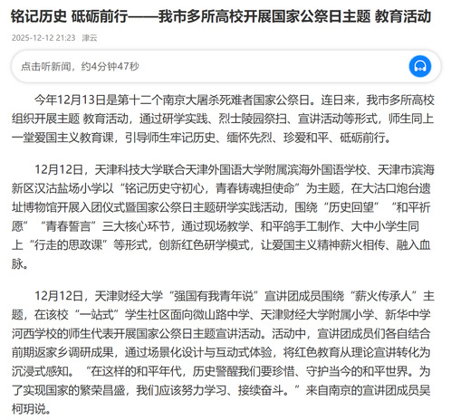 12月12日,在天津城建大学举办的“铭记历史惜和平,青年挺膺向未来”国家公祭日主题交流活动中,该校关工委委员及“红旗班”学员代表通过专题史料解读、观看主题微视频等形式,为青年学子带来一堂生动的爱国主义教育课。参加活动的青年学子纷纷表示,要铭记苦难历史、汲取前行力量、赓续红色血脉,努力成长为堪当民族复兴重任的时代新人。