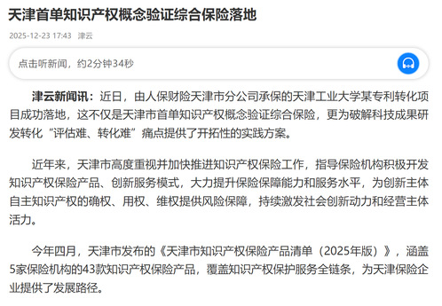 今年四月,天津市发布的《天津市知识产权保险产品清单(2025年版)》,涵盖5家保险机构的43款知识产权保险产品,覆盖知识产权保护服务全链条,为天津保险企业提供了发展路径。