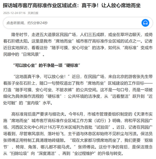 高标准背后是严要求与细功夫。今年6月,市城市管理委组织制定的《天津市实施“席地而坐”城市客厅高标准作业区域工作方案(试行)》明确,将和平区民园广场、河西区文化中心共计16万平方米区域列为首批“试验田”。近日,记者在民园广场看到,尽管寒风凛冽、落叶纷飞,主干道与休息区却始终不见积尘与污渍。保洁员张师傅正用特制工具清理地砖缝隙。“现在大家都习惯席地而坐了,我们更要‘抠细节’,椅背、角落,哪儿都不能马虎。”张师傅说。这份干净的背后,是保洁理念从“扫除垃圾”向“深度清洁”、再到“全过程维护”的升级与转变。