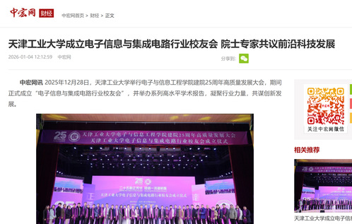 中宏网讯 2025年12月28日,天津工业大学举行电子与信息工程学院建院25周年高质量发展大会,期间正式成立“电子信息与集成电路行业校友会”,并举办系列高水平学术报告,凝聚行业力量,共谋创新发展。
