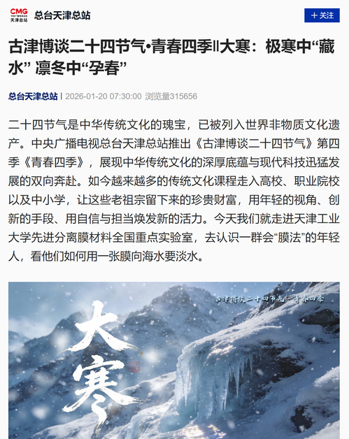 二十四节气是中华传统文化的瑰宝,已被列入世界非物质文化遗产。中央广播电视总台天津总站推出《古津博谈二十四节气》第四季《青春四季》,展现中华传统文化的深厚底蕴与现代科技迅猛发展的双向奔赴。如今越来越多的传统文化课程走入高校、职业院校以及中小学,让这些老祖宗留下来的珍贵财富,用年轻的视角、创新的手段、用自信与担当焕发新的活力。今天我们就走进天津工业大学先进分离膜材料全国重点实验室,去认识一群会“膜法”的年轻人,看他们如何用一张膜向海水要淡水。
