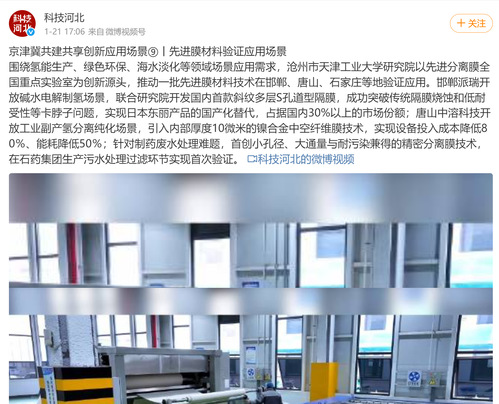 “科技河北”微博丨京津冀共建共享创新应用场景⑨丨先进膜材料验证应用场景