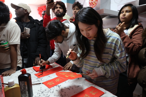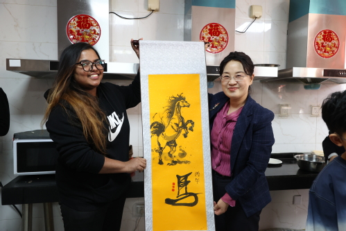 慰问的最后一站,校领导来到北苑留学生公寓,与留学生们亲切互动,一同包饺子、话新春、送祝福。现场气氛热烈,师生们共同书写福字,在笔走龙蛇间感受中华传统文化的魅力。郭滇华与留学生亲切交谈,询问假期安排和学习生活,鼓励大家多体验中国年俗,在天工大度过一个温馨难忘的春节。留学生们纷纷表示,学校的关怀让他们在校园里度过的这个中国年格外温暖、特别难忘。