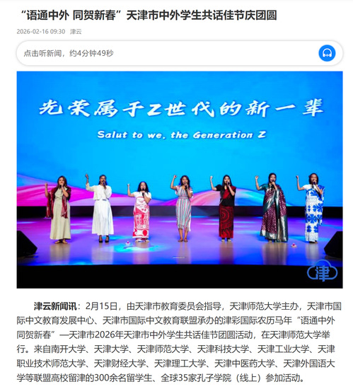 津云新闻讯:2月15日,由天津市教育委员会指导,天津师范大学主办,天津市国际中文教育发展中心、天津市国际中文教育联盟承办的津彩国际农历马年“语通中外 同贺新春”—天津市2026年天津市中外学生共话佳节团圆活动,在天津师范大学举行。来自南开大学、天津大学、天津师范大学、天津科技大学、天津工业大学、天津职业技术师范大学、天津财经大学、天津理工大学、天津中医药大学、天津外国语大学等联盟高校留津的300余名留学生、全球35家孔子学院(线上)参加活动。