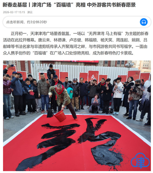 正月初一,天津津湾广场墨香氤氲,一场以“无界津湾 马上有福”为主题的新春活动在此拉开帷幕。唐云来、林德谦、卢志健、韩福顺、杨天笑、周连起、姚钢、吕献峰等书法名家与非遗剪纸传承人齐聚海河之畔,与市民游客共同书写福字。一面由众人携手创作的“百福墙”在广场入口处惊艳亮相,成为新春特色打卡景观。