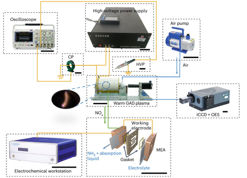 针对传统电化学氮还原反应(N2RR)中氮氮三键难以打破、法拉第效率及产氨速率低下的学术瓶颈,刘敬祥教授团队联合中国科学技术大学熊宇杰教授、中国科学院电工研究所邵涛研究员等团队,创新性地提出了一种等离子体-电化学偶联固氮(PE-N2RR)的新型系统。该系统将滑弧放电(GAD)等离子体反应器与膜电极组件(MEA)电化学反应器相结合。在实际操作中,空气首先通过等离子体系统转化为氮氧化物(NOx),随后在MEA反应器中被电化学转化为氨。这一整合策略不仅大幅降低了反应能垒,实现了空气和水的直接资源化利用,还克服了常规电化学固氮效率低下的限制。