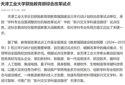 天津工业大学近日获批教育部教育强国建设三年行动计划综合改革试点单位,承担“学科专业设置调整优化机制改革试点”中的“新兴交叉学科建设路径”试点任务。这标志着该校在服务国家重大战略需求、优化学科专业布局方面又迈出了关键一步。