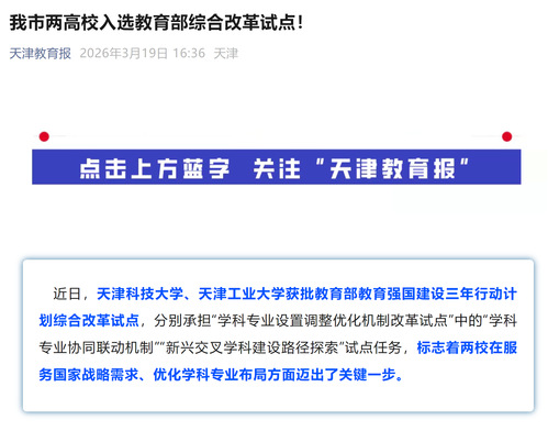 “天津教育报”微信公众号丨我市两高校入选教育部综合改革试点!
